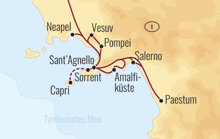 Kennen Sie das Land, in dem die Zitronen blühen? Die „Amalfitana“ oder „Göttliche Küste“, wie die Einheimischen die für sie schönste Küste der Welt nennen, ist das Ziel dieser Reise. Die Landschaft ist unvergleichlich. Der Kontrast von tiefblauem Meer, schroffen Steilfelsen, pastellfarbenen Dörfern, die sich malerisch und nahezu abenteuerlich an Felshänge kauern, in Terrassen angelegte Zitronengärten und Weinberge, geheimnisvolle Höhlen und Grotten, von Wind und Meer zerfressene Buchten und Mittelmeerpflanzen wie aus dem Botanikbuch, begeistert jährlich Millionen Besucher aus aller Welt. Nach jeder Kurve bieten sich dem Betrachter neue Ausblicke, deren Faszination er sich nicht entziehen kann.