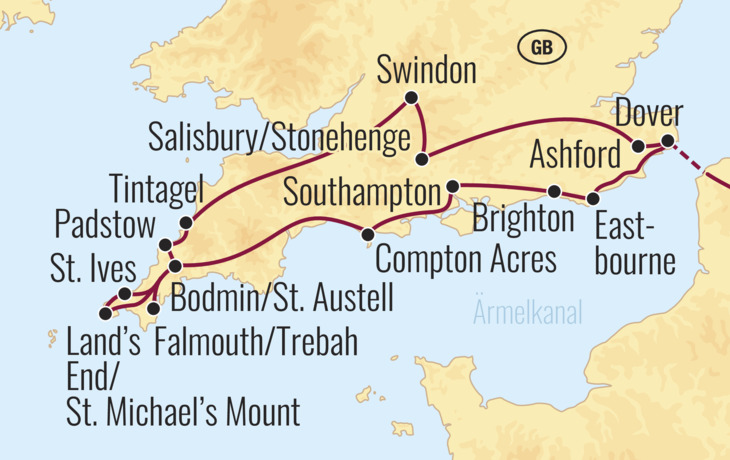Erleben Sie die Faszination Südenglands und lernen Sie eindrucksvolle Landschaften, elegante Seebäder, schroffe Klippen und farbenprächtige Parklandschaften kennen. Das milde, durch den Golfstrom begünstigte Klima, lässt besonders im idyllischen Südwesten wahre Gartenträume entstehen. Wer den Hauch von Romantik sucht, wird ebenfalls fündig, denn Cornwall ist das Rosamunde Pilcher Land. Lassen Sie sich verzaubern auf einer Reise in eine Welt voller Magie, Geschichte und Naturschönheiten und besuchen Sie die Originalschauplätze der romantischen Verfilmungen. Eine Reise voller Höhepunkte erwartet Sie!